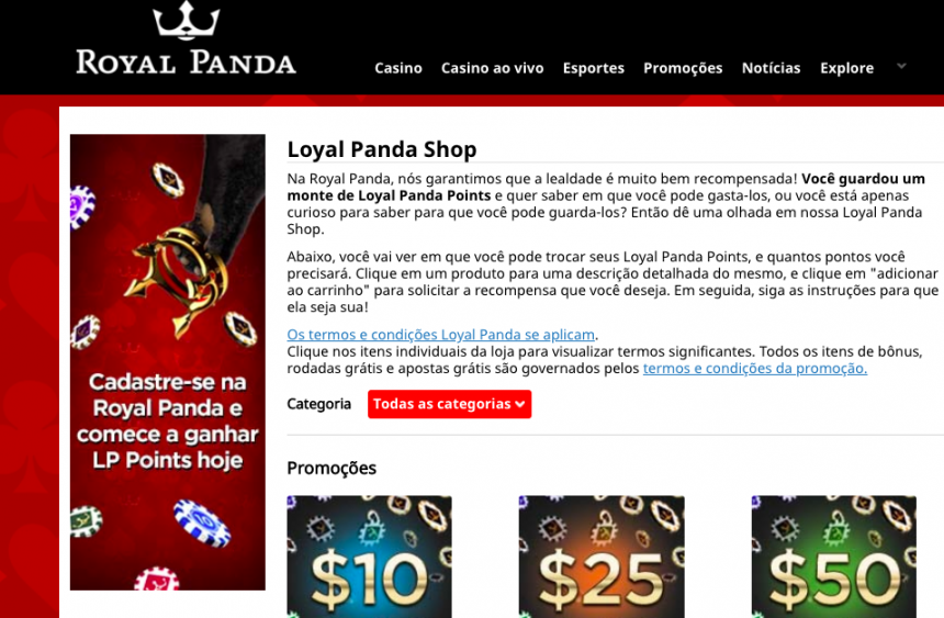 Bônus de fidelidade: Loyal Panda é o programa de fidelidade do cassino online Royal Panda. O programa consiste em premiar os jogadores assíduos, basta aceitar receber as promoções de marketing enviadas via e-mail no ato de cadastro, para estar apto a participar da promoção. Quanto mais depósitos feitos, mais pontos serão acumulados. Os pontos adquiridos poderão ser trocados no Loyal Panda Shop por bônus, rodadas grátis, apostas grátis e até produtos como: Iphones, laptops e produtos da marca Royal Panda.