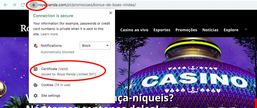 O cassino online Royal Panda é seguro! Sua plataforma possui o certificado de segurança Comodo e é criptografada, como vocês podem ver na imagem abaixo. O selo de segurança é simbolizado por um cadeado inserido antes do domínio do website, como na imagem abaixo. Para saber se o certificado de segurança é válido, basta clicar no cadeado, então você terá acesso a informação completa sobre o domínio que está acessando.